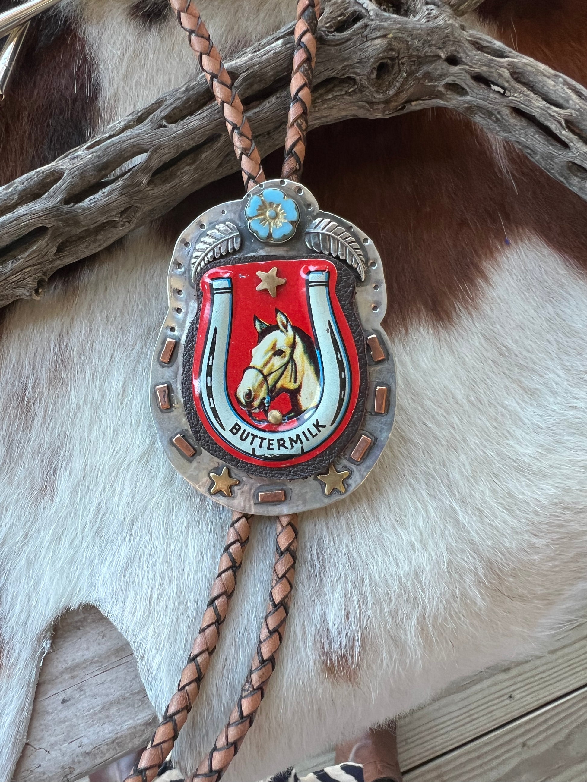 One of a kind bolo! This is a 1950’s vintage Post Raisin Bran cereal trinket badge on sterling silver with sterling silver tips. Copper and brass embellishments. Genuine leather cord. 2.5 x 1.5