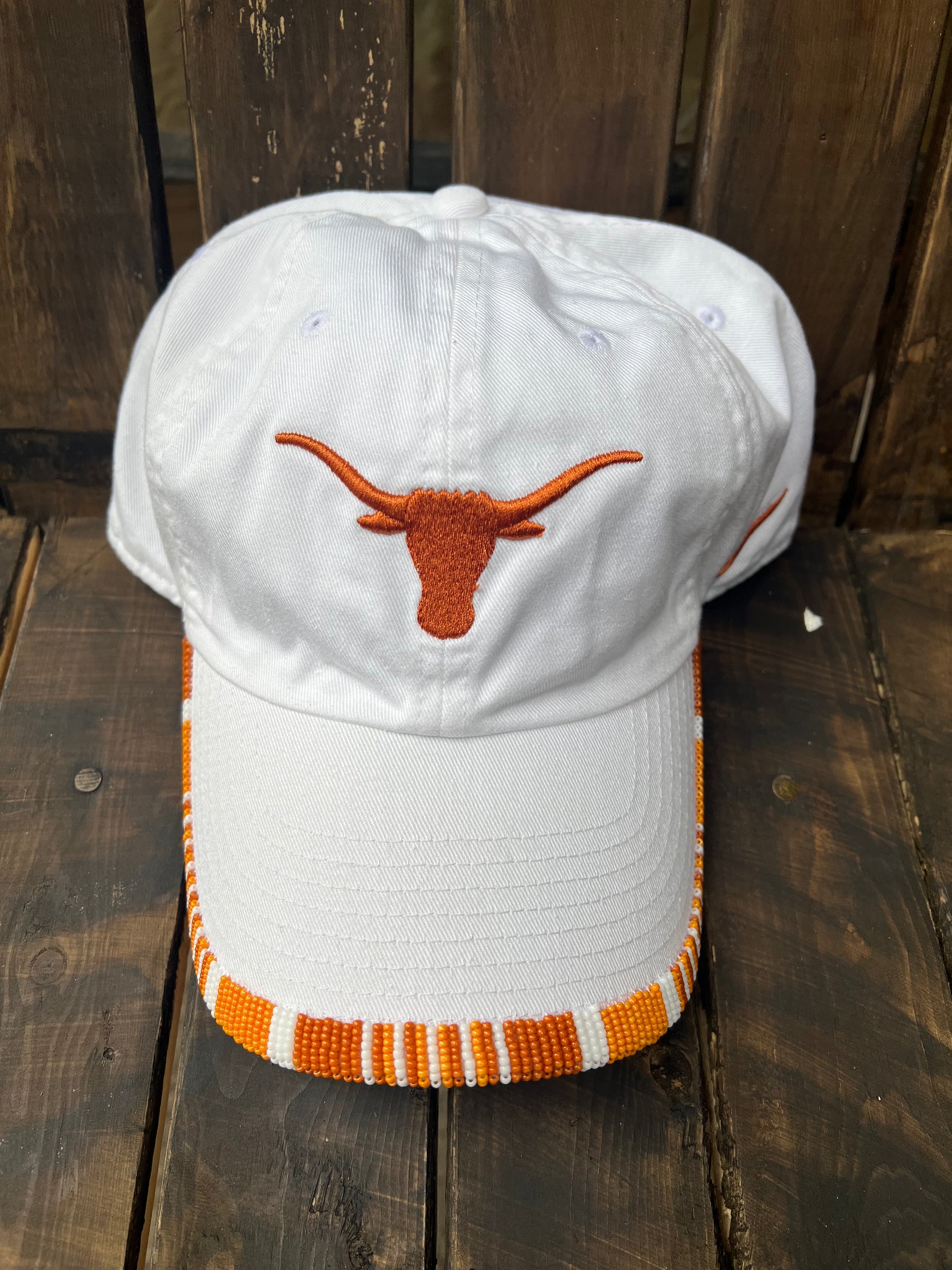 Hand beaded Nike UT Longhorns hat. Cotton with adjustable metal buckle on back. Size 11/0 seed beads. Hook ‘Em’ Horns!